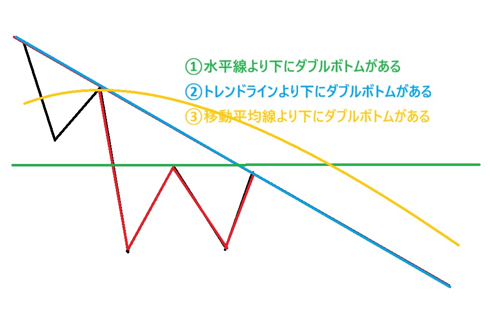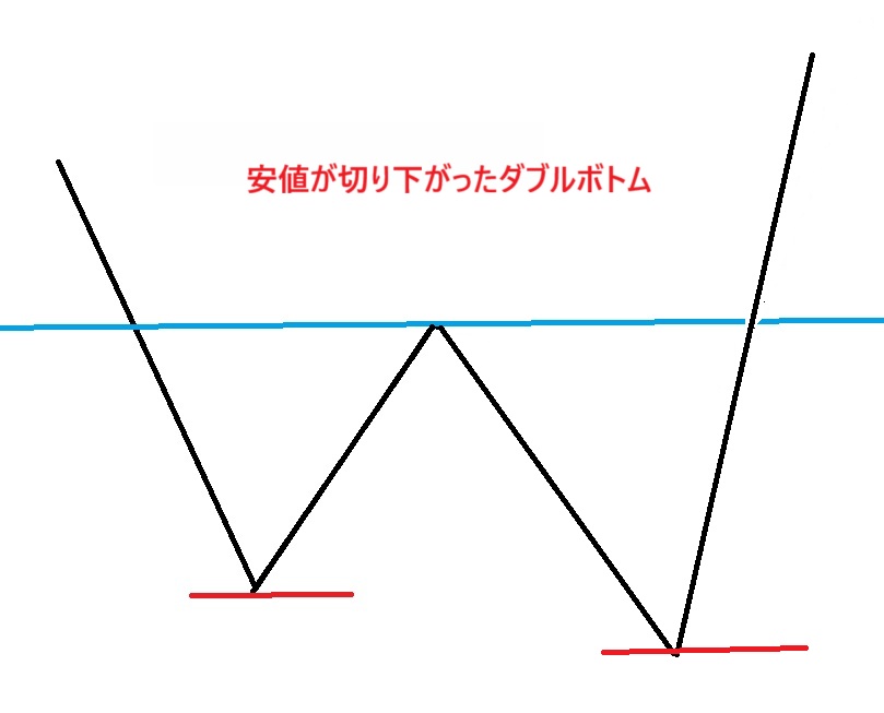 - 髭で最安値を更新しても実体で抜けていなければダブルボトムは成立する