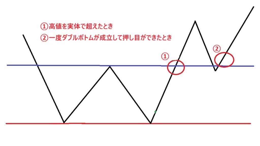 - ダブルボトムのエントリーポイントと利確予定ポイント